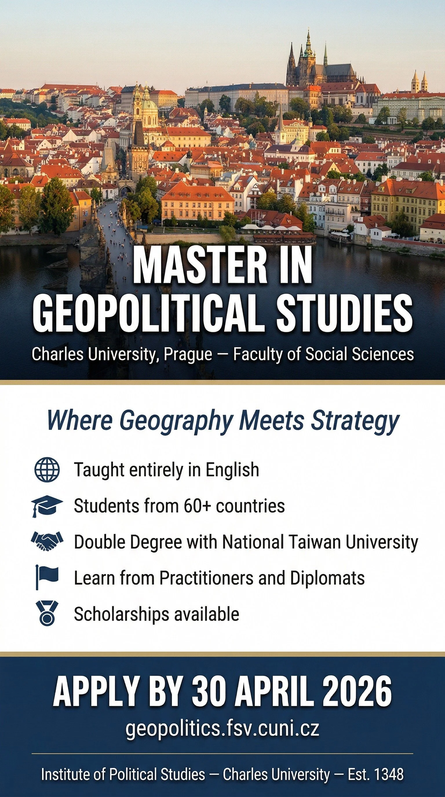 Institute of Political Studies (Faculty of Social Sciences, Charles University in Prague) is pleased to announce that applications for the MA programme Geopolitical Studies (GPS), taught exclusively in English, are open until 30 April 2026. Geopolitical Studies is a fully accredited English-taught programme that, through its academic approach, aims to attract students from around the globe.